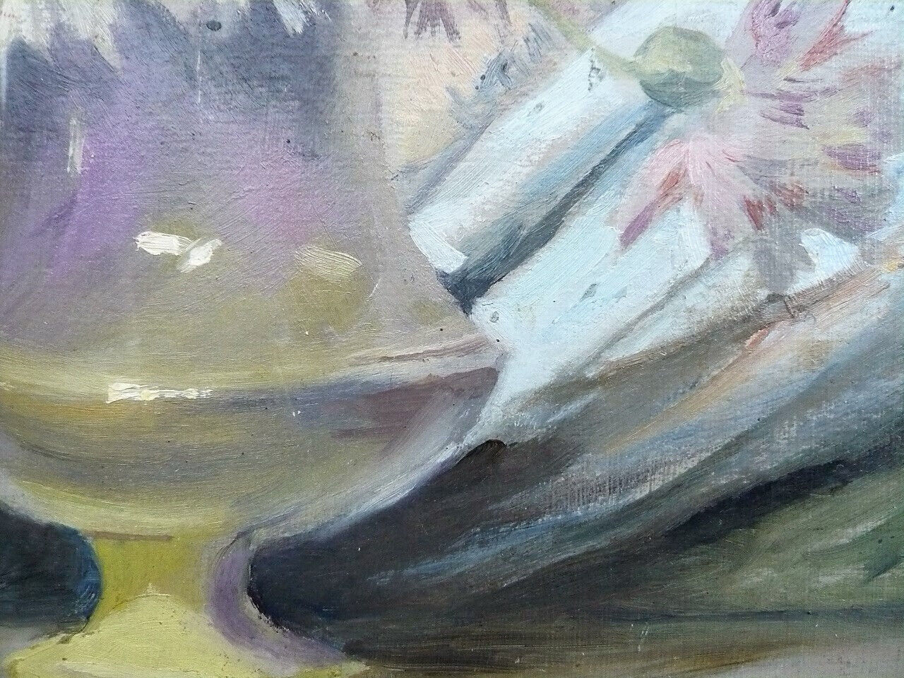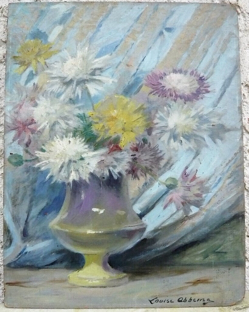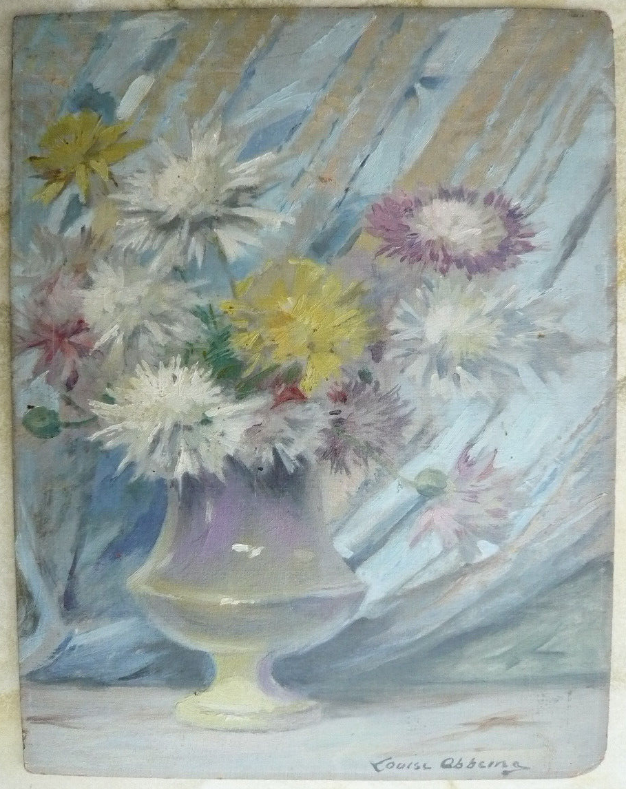 - Cette huile sur carton de 35 cm de haut sur 25 de large, signée en bas à droite, non datée et représentant un bouquet de fleurs dans un vase à pied, était en vente en février 2023 sur le site d'enchères en ligne eBay avec une mise à prix de 300 €. On reproduit ici les clichés mis en ligne par le vendeur.