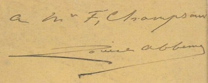 - Ce portrait photographique de Louise Abbéma en plan taille, est édité par Achille Melandri. Un exemplaire en était en vente en février 2023 sur le site d'enchères en ligne eBay avec une mise à prix de 150 €. L'exemplaire en question, développé en sépia sur une carte de 10,5 cm de haut sur 6,3 de large, porte au recto une dédicade à l'homme de lettres et journaliste Félicien Champsaur (1858-1934), signée de Louis Abbéma. On reproduit ici les clichés de cette carte mis en ligne par le vendeur.