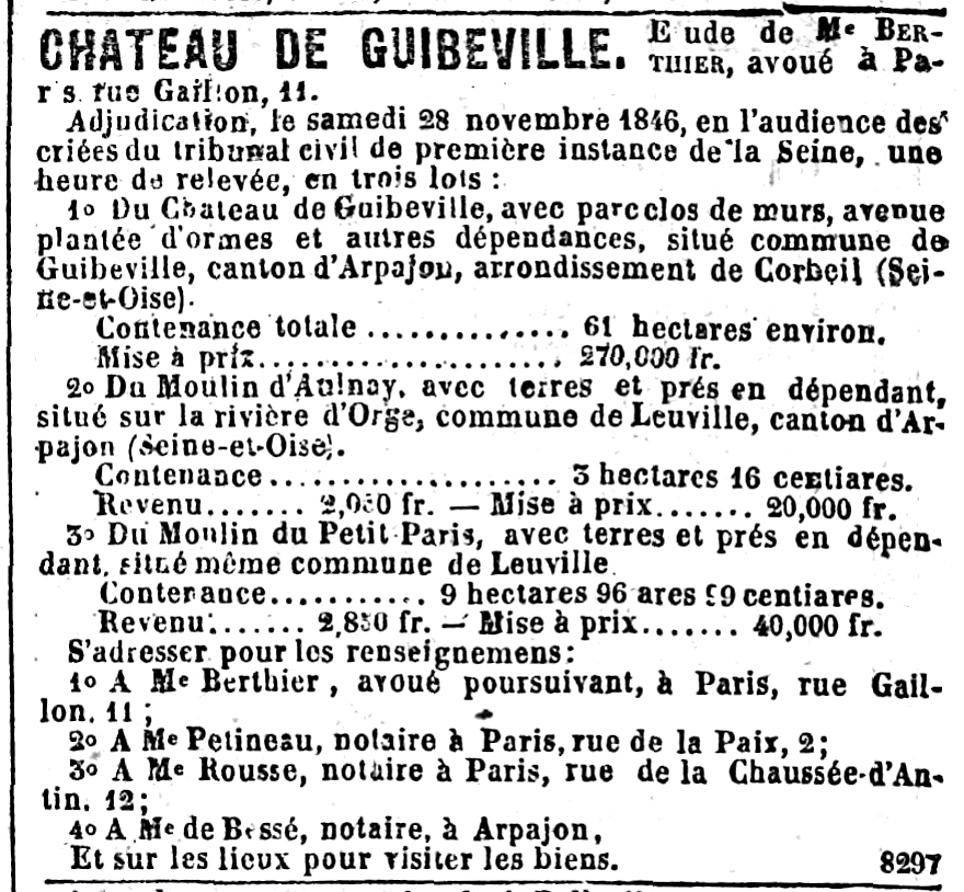 - “Château de Guibeville” (vente), Le Constitutionnel (2 novembre 1846) 3. (Texte analogue publié dans La France du 31 octobre 1846 pp. 3-4).