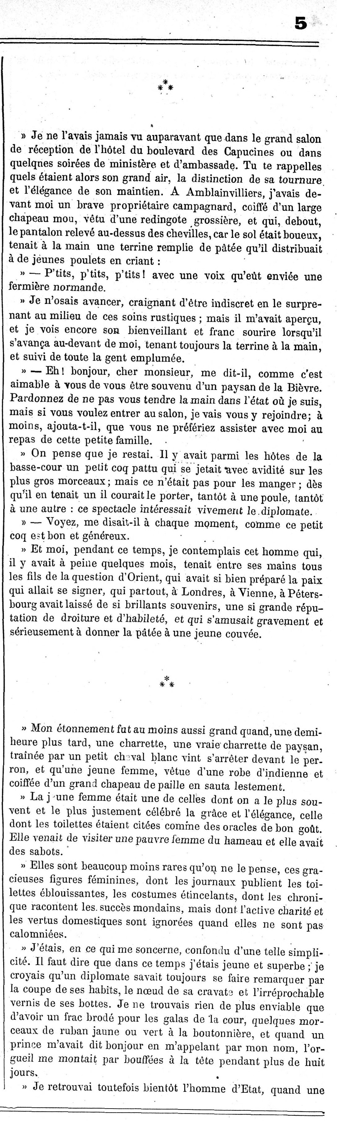 Je ne l'avais jamais vu auparavant que dans le grand salon de réception de l'hôtel du boulevard des Capucines ou dans quelques soirées de ministère et d'ambassade. Tu te rappelles quels étaient alors son grand air, la distinction de sa tournure et l'élégance de son maintien. À Amblainvilliers, j'avais devant moi un brave propriétaire campagnard, coiffé d'un large chapeau mou, vêtu d'une redingote grossière, et qui, debout, le pantalon relevé au-dessus des chevilles, car le sol était boueux, tenait à la main une terrine remplie de pâtée qu'il distribuait à de jeunes poulets en criant: