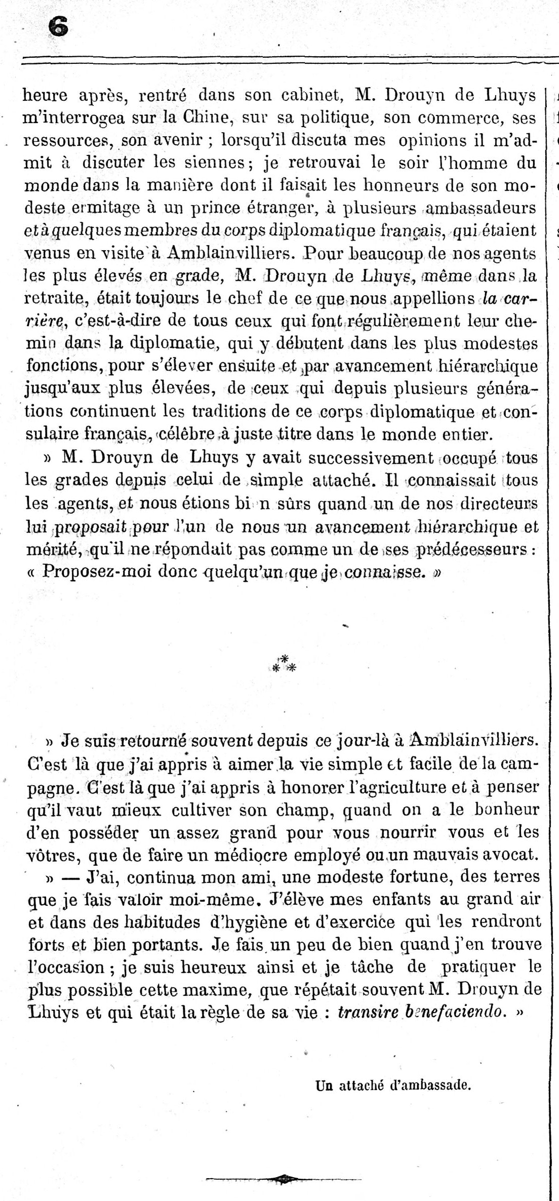 Je retrouvai toutefois bientôt l'homme d'État, quand une heure après, rentré dans son cabinet, M. Drouyn de Lhuys m'interrogea sur la Chine, sur sa politique, son commerce, ses ressources, son avenir; lorsqu'il discuta mes opinions il m'admit à discuter les siennes; je retrouvai le soir l'homme du monde dans la manière dont il faisait les honneurs de son modeste ermitage à un prince étranger, à plusieurs ambassadeurs et à quelques membres du corps diplomatique français, qui étaient venus en visite à Amblainvilliers. Pour beaucoup de nos agents les plus élevés en grade, M. Drouyn de Lhuys, même dans la retraite, était toujours le chef de ce que nous appelions la carrière, c'est-à-dire de tous ceux qui font régulièrement leur chemin dans la diplomatie, qui y débutent dans les plus modestes fonctions, pour s'élever ensuite et par avancement hiérarchique jusqu'aux plus élevées, de ceux qui depuis plusieurs générations continuent les traditions de ce corps diplomatique et consulaire français, célèbre à juste titre dans le monde entier.