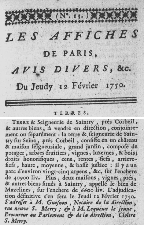 - Mise en vente en février 1750. — Les affiches de Paris, avis diversn etc. (jeudi 12 février 1750) 1.