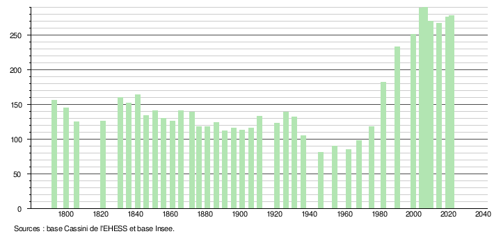 Sur la base de données empruntées, pour les années 1793-1999, au site du Laboratoire de Démographie et d'Histoire Sociale de l'EHESS, École des hautes études en sciences sociales; et, pour les années 2006 à 2021, au site de l'INSEE, Institut national de la statistique et des études économiques.