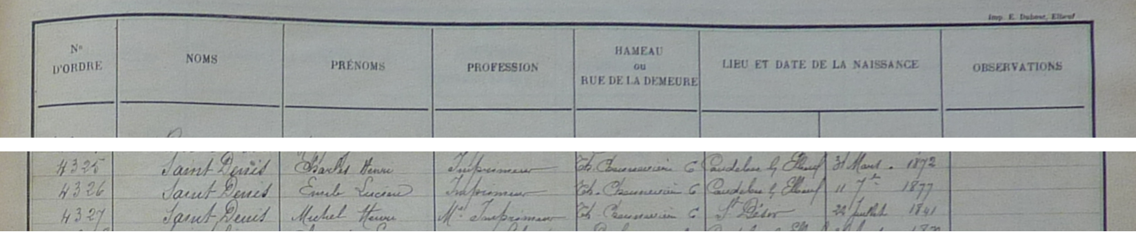 - Listes électorales 1885 (Elbeuf), 1903 (Caudebec-lès-Elbeuf), 1913 (Elbeuf) — AD76 8M/86, 3M/67, 3M/72