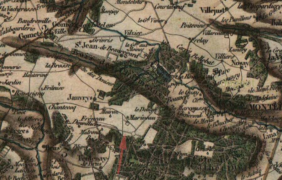 < Commence aussi en 1548, la construction du premier manoir de Janvry: Christophe de Vaulx, maçon demeurant à Limoux, confesse avoir promis à noble homme Jehan de Baillon, receveur des tailles, … de lui faire en ses terres de Marivaulx ung grand corps dhostel de onze toises de long de dehors et de vingt ung pieds de large, de deux pieds depuis le rez de chaussée en fondation jusqu'au un pied et demy … massoné de moeslon chaulx et sable garny de huit chesnes de pierres de grais taillés pour supporter les poultres en les quatre encoingures, aussy de pierres de grais taillés par dedans faire la vis dudit grand corps dhostel… par dehors faire les portes des perrons de troys pieds trois poulces de large et six pieds de hault et lhuisserie du cellier le tout de pierre de grais taillées, … faire les jambages et manteaux de cheminées tout de plastre par dedans les chambres faire lestuyaux qui passeront dans le grenier,… faire les cloisons des chambres garde robbes et chapelle de plastre faire une petite saillie au hault dudit corps dhostel pour gueter les ?… commencer à besongner les grais… ce marché fit moyennant 15 sols par chacune toise . La semaine suivante, il passe un second marché avec Jehan Decroix et Sébastien Poullain massons en plastre demeurant à Chastres soubz Montlhéry qui confessent avoir promis au seigneur de Marivaulx…., de mettre la thuille à saulnette pour couvrir un corps dhostel audit lieu de Marivaulx… ce marché fait moyennant 26 lt. >