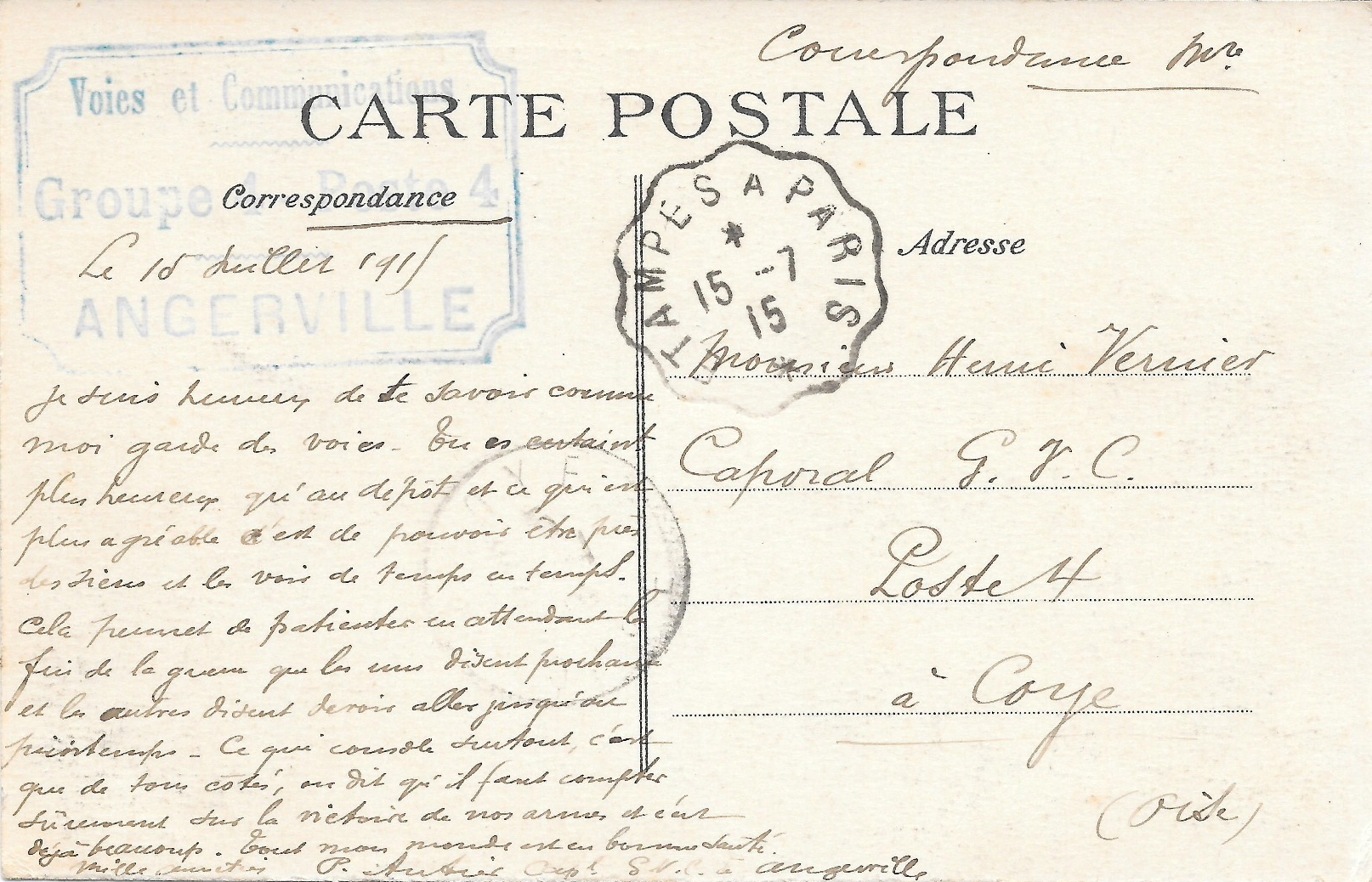 - Destinataire: Monsieur Henri Vernier, caporal GV.V.C., poste 4, à Coye (Oise)