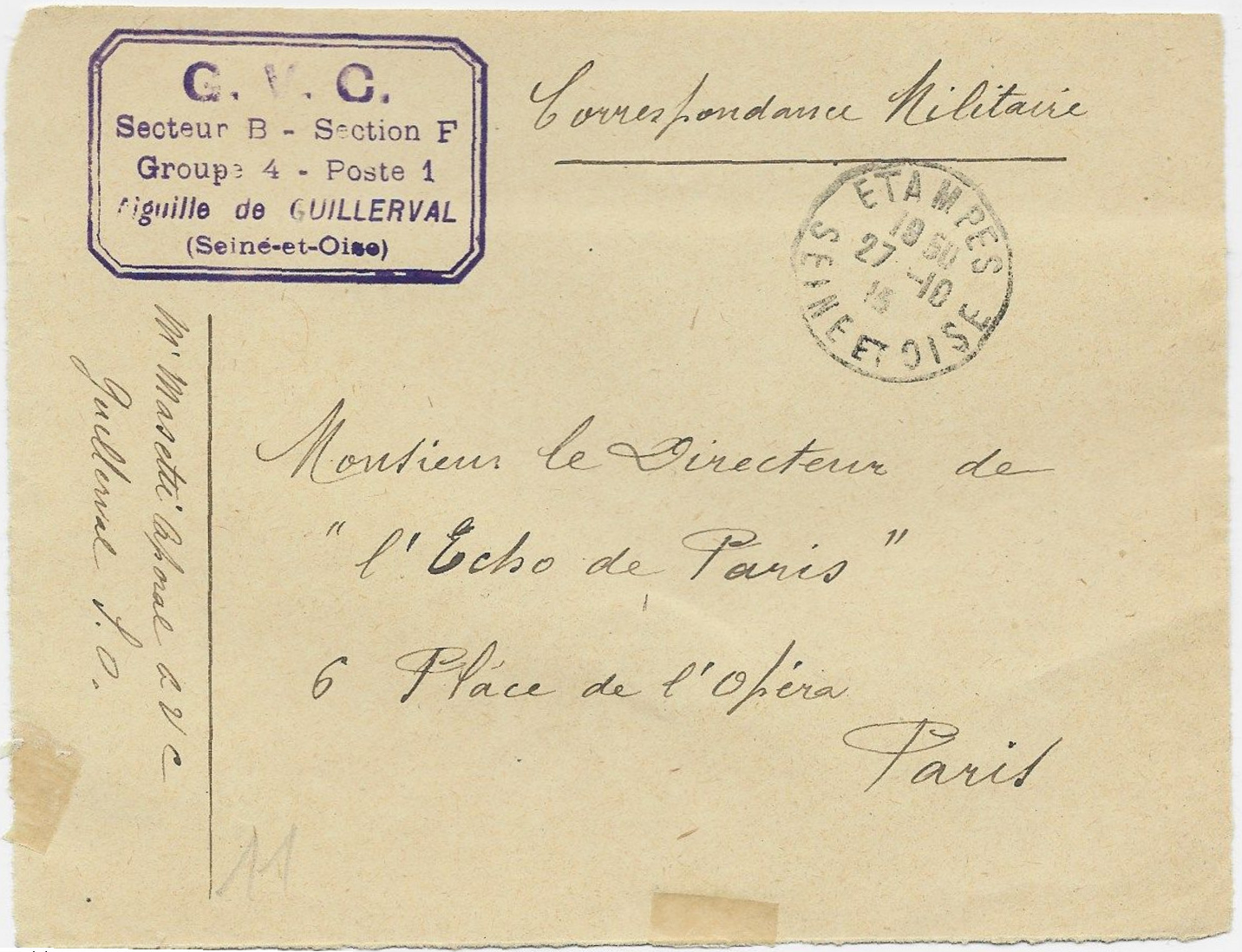 - Expéditeur: M. Masetti, caporal GVC, Guillerval (Seine-et-Oise).