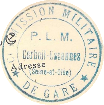 - Tampon: Commission militaire de gare - P.L.M. Corbeil-Essonnes (Seine-et-Oise).