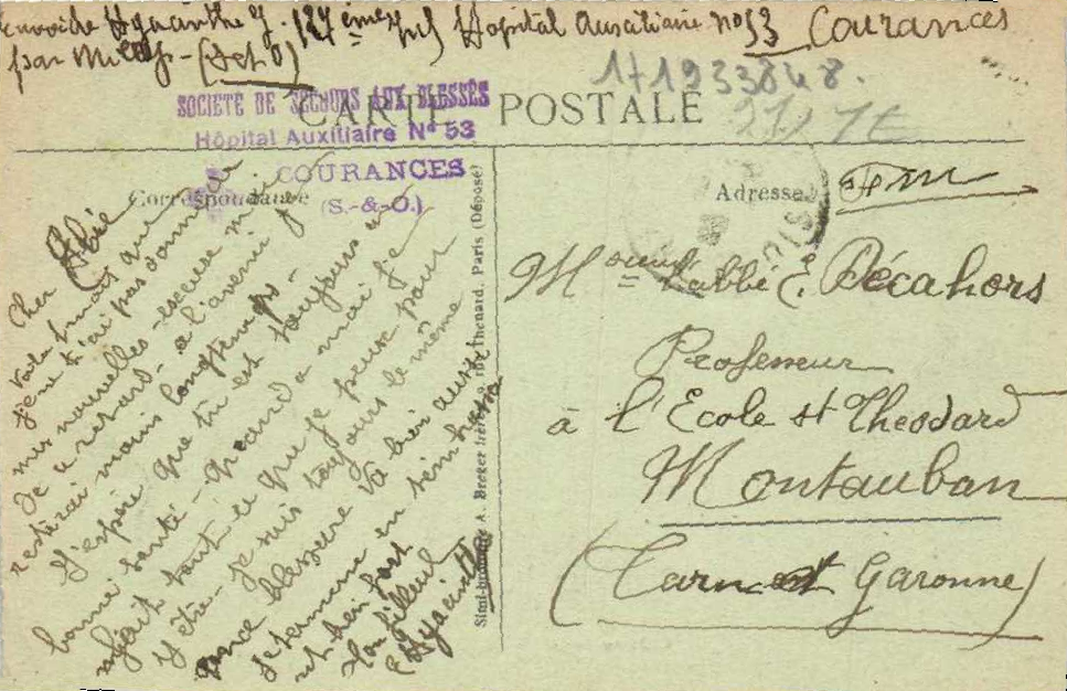 - Expéditeur: ? Hyacinthe, 127e infanterie, Hôpital auxiliaire n°53, Courances par Milly (Seine-et-Oise)