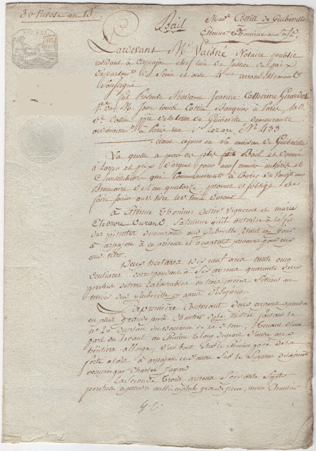 Deux baux passés par la veuve Cottin en son Château de Guibeville (30 nivose an 13, 20 janvier 1805)