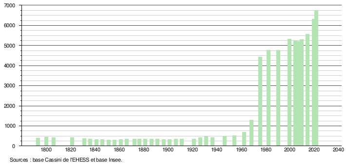 - Accroissement démographique rapide dans la seconde partie du XXe siècle et jusqu'à nos jours: la population qui avait oscillé entre 300 à 350 habitants, finit par compter 7078 habitants en 2022: elle a été multipliée par 20 en un siècle1).
