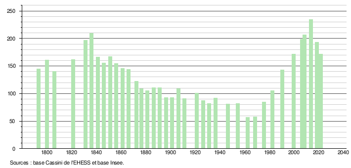 Sur la base de données empruntées, pour les années 1793-1999, au site du Laboratoire de Démographie et d'Histoire Sociale de l'EHESS, École des hautes études en sciences sociales; et, pour les années 2006 à 2021, au site de l'INSEE, Institut national de la statistique et des études économiques.