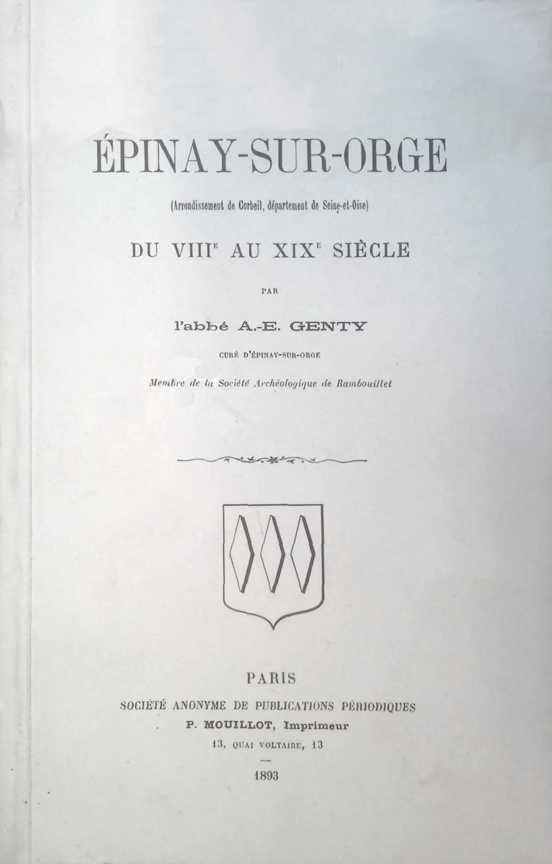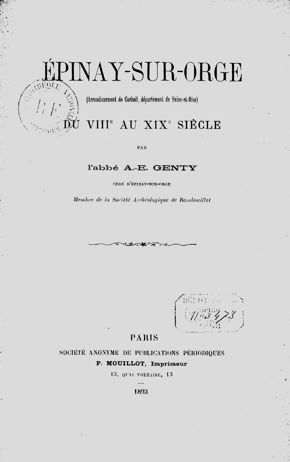 - Antoine-Eugène Genty, Épinay-sur-Orge, arrondissement de Corbeil, département de Seine-et-Oise, du VIIIe au XIXe siècle (IV+184 p, planches), Paris, Société anonyme de publications périodiques, 1893.