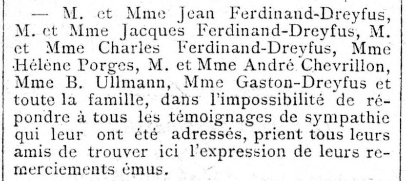 - Ferdinand-Dreyfus (Jacques, Isidore), né le 8 décembre 1884 à Paris (17e) (Seine), décédé le 5 août 1943 à Auschwitz (Pologne).