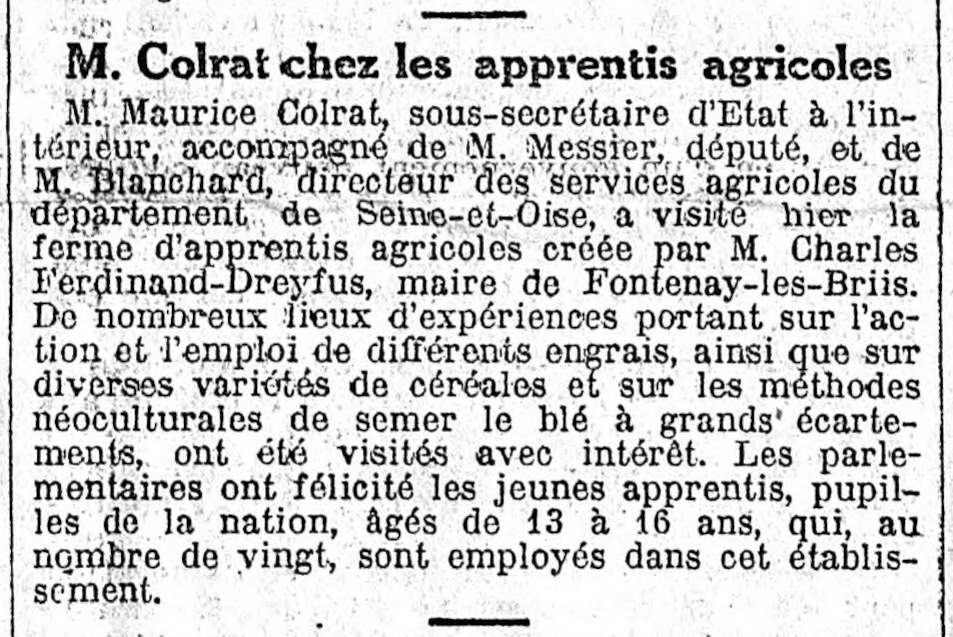- Sur ces 3.007 Pupilles, M. Charles Ferdinand-Dreyfus demande trente garçons pour sa ferme d’apprentissage agricole de Bel-Air, par Briis-sous-Forges.