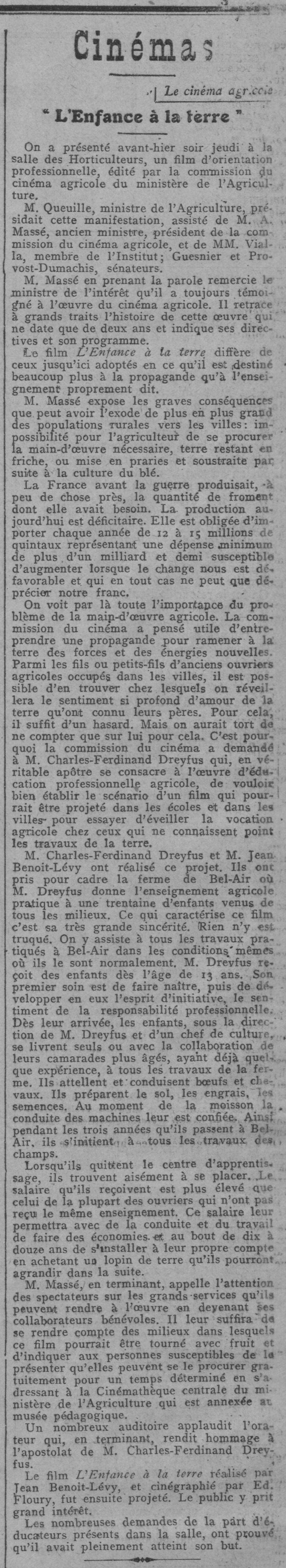 - Anonyme, “Le cinéma agricole. 'L'Enfance à la terre'”, Comœdia 19/4484 (26 mars 1925) 3