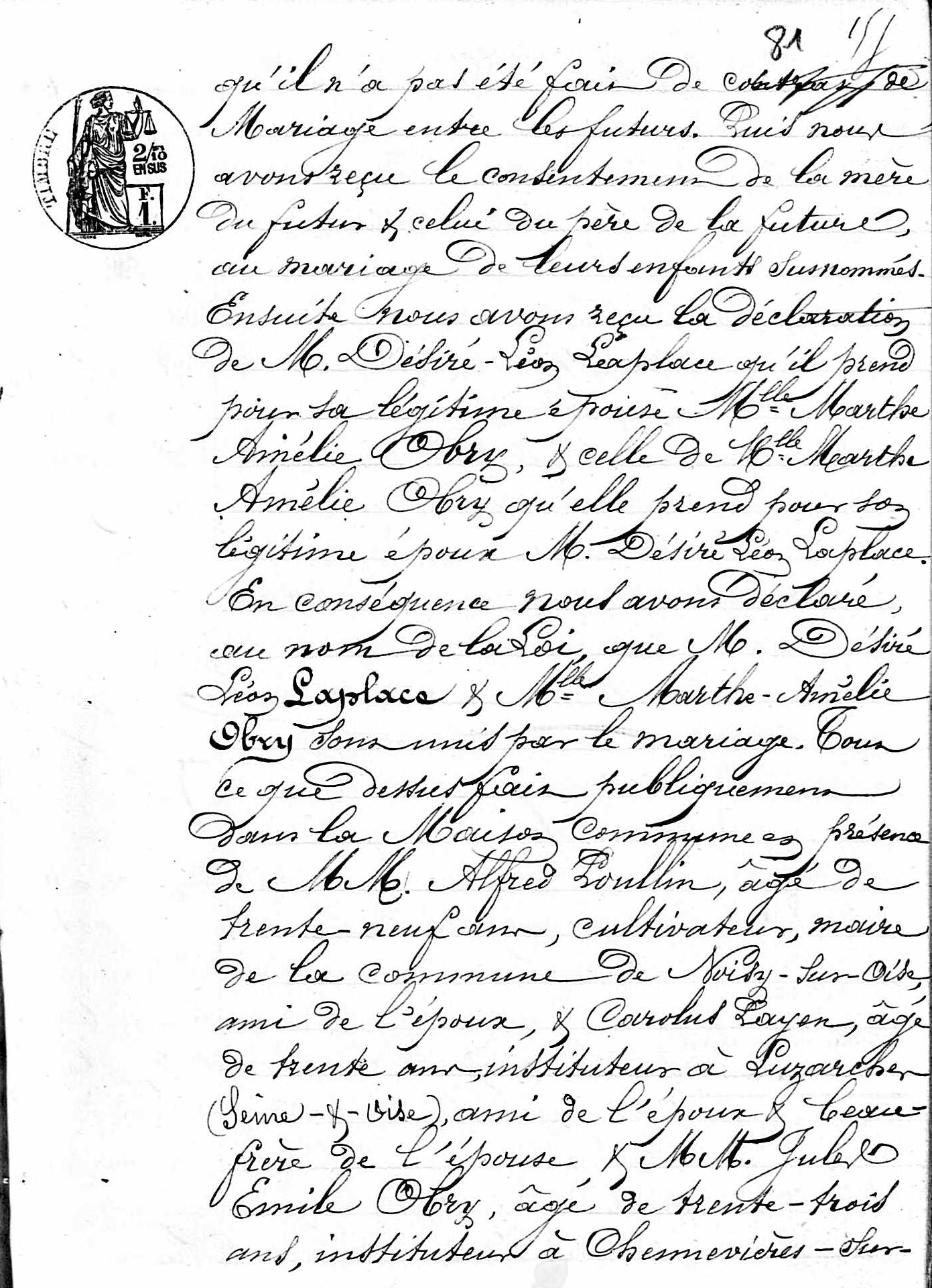 - Ensuite, nous avons reçu la déclaration de M. Désiré Léon Laplace qu'il prend pour légitime épouse Mlle Marthe Amélie Obry, et celle de Mlle Marthe Amélie Obry qu'elle prend pour légitime époux M. Désiré Léon Laplace.