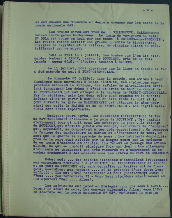 Quelques jours après, les allemands installent un centre de ravitaillement d'essence à la gare de Boutigny. Des camions stationnent jour et nuit sous les ombrages du pays. Les village de Boutigny, qui n'avait jamais été occupé, est envahi de “feldgrau” qui, cependant, se comportent à peu près correctement. On remarque la fatigue des conducteurs de camions et l'énervement de tous. On sent que la guerre se rapproche de nous. Les habitants domiciliés près de la gare sont affolés par le danger couru en présence de ce train d'essence et d'huile; ils fuient au passage des avions alliés, ce qui se produit plusieurs fois par jour. Les allemands d'ailleurs ne paraissent pas très rassurés et s'empressent de se cacher prudemment à ces moments sous les arbres du parc de Bélesbat.