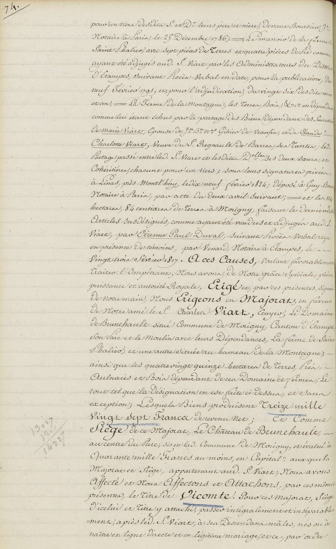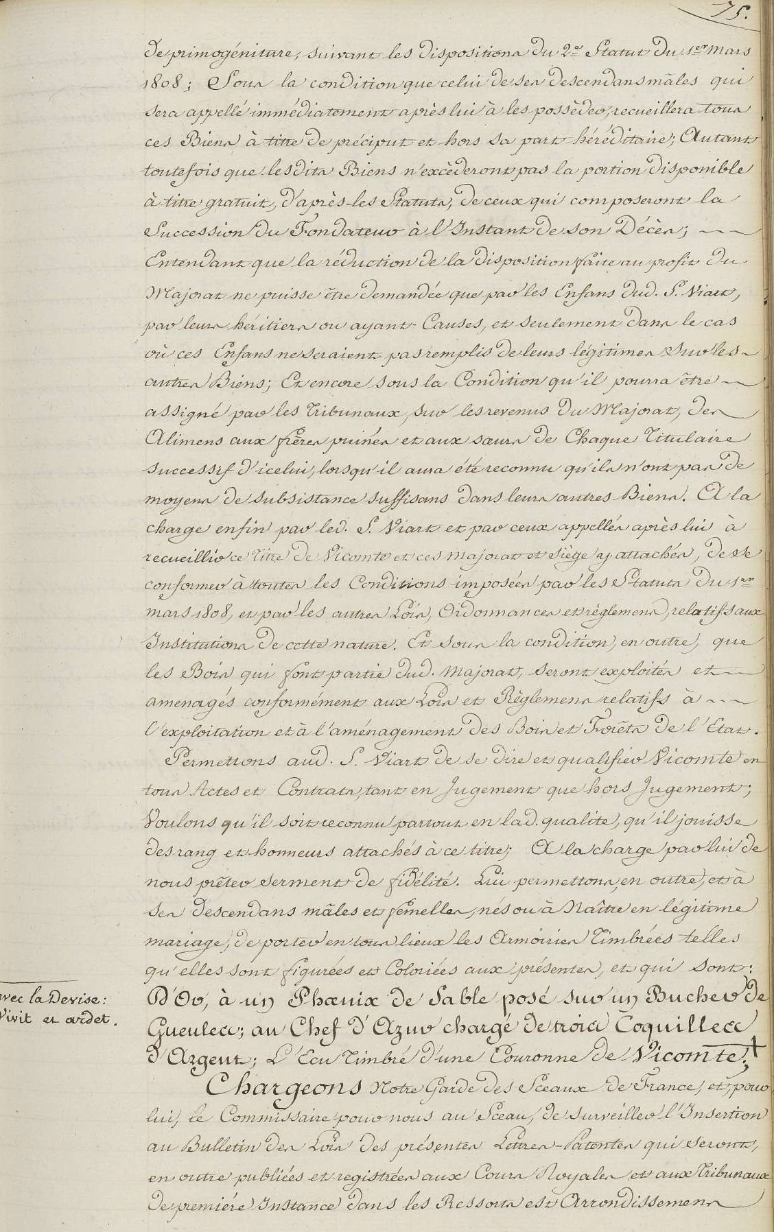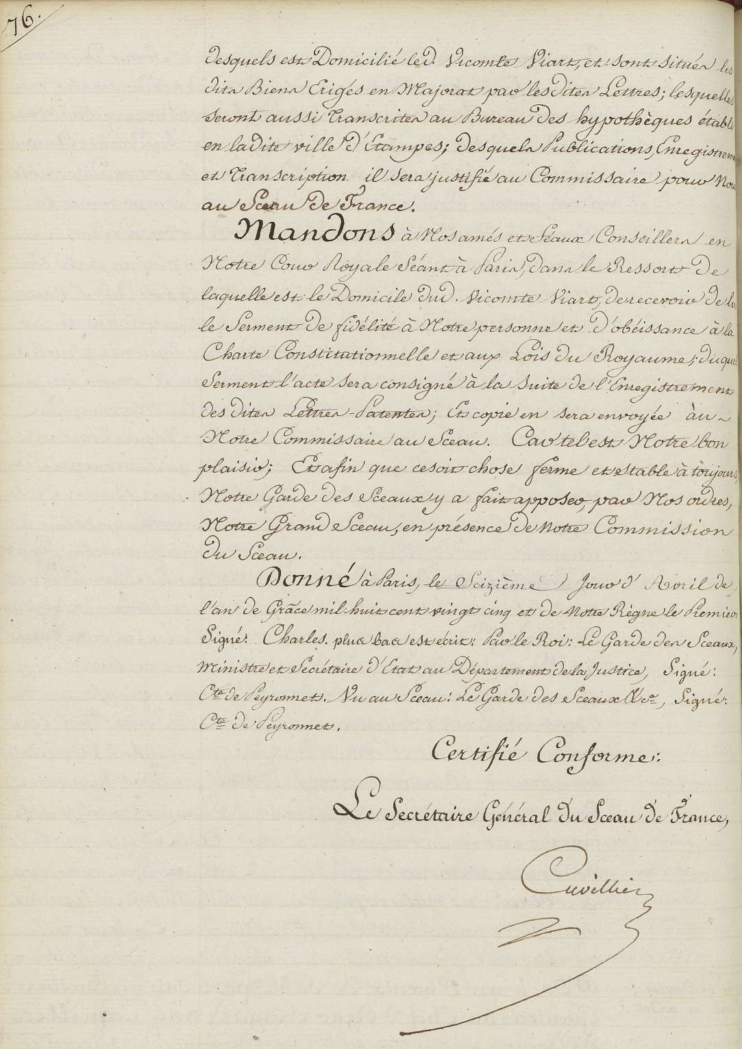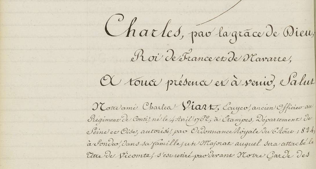 Institution de majorat attaché au titre de vicomte au profit de Charles Viart, accordée par lettres patentes du 16 avril 1825, à Paris