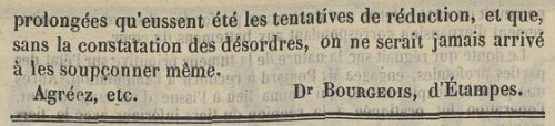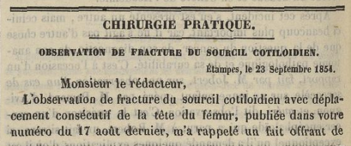 - L'observation de fracture du sourcil cotiloïdien avec déplacement consécutif de la tête du fémur, publiée dans votre numéro du 17 août dernier, m'a rappelé un fait offrant de |475| l'analogie avec celui de l'habile chirurgien de l'hôpital Cochin, et qui, sous certains rapports, me semble même plus curieux encore, vu cette particularité, que le fragment osseux, détaché, non du rebord cotyloïdien, mais bien du grand trochanter, est venu se loger dans une boîte osseuse et a rendu la réduction de l'os complètement impossible. Si ce fait vous paraît digne de voir le jour, je vous prie de lui accorder l'immense publicité de votre journal.