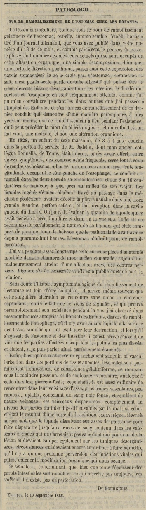 - Justin Bourgeois, "Sur le ramollissement de l'estomac chez les enfants", L'Union médicale 10/14 (1856) 455.