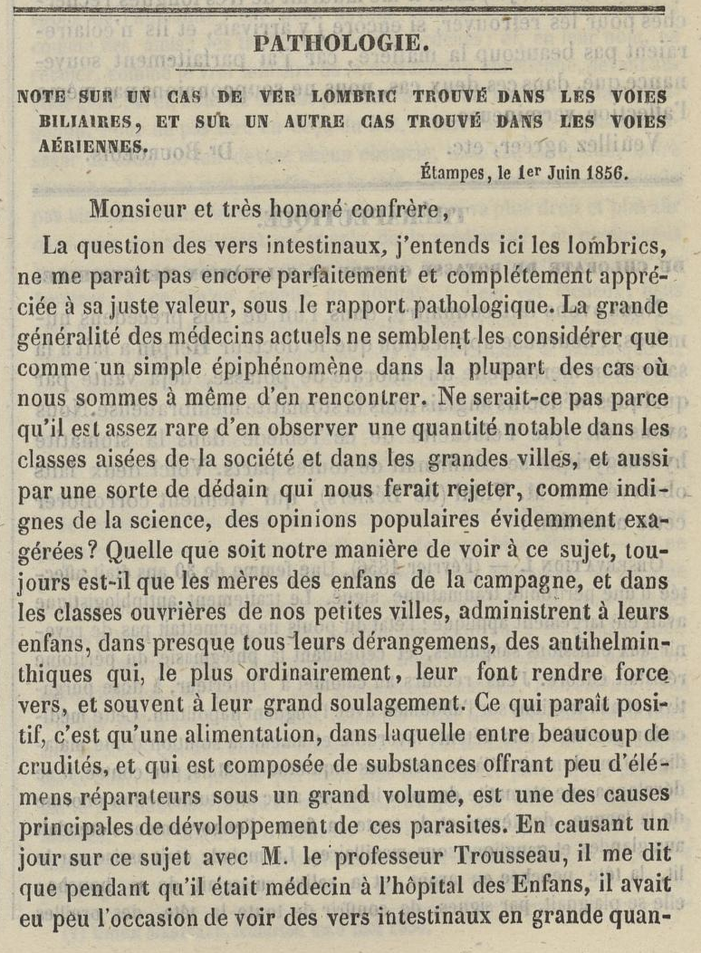 Note sur un cas de vers lombric trouvé dans les voies biliaires, et sur un autre cas trouvé dans les voies aériennes (1856)