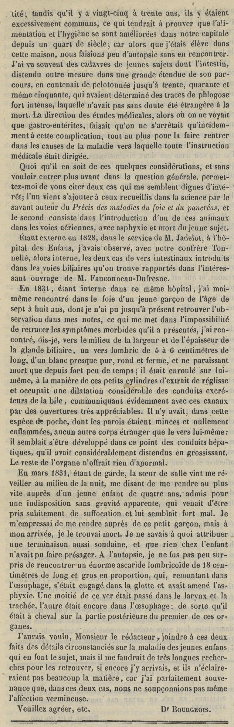 - En mars 1831, étant de garde, la sœur de salle vint me réveiller au milieu de la nuit, me disant de me rendre au plus vite auprès d un jeune enfant de quatre ans, admis pour une indisposition sans gravité apparente, qui venait d'être pris subitement de suffocation et lui semblait fort mal. Je m'empressai de me rendre auprès de ce petit garçon, mais à mon arrivée, je le trouvai mort. Je ne savais à quoi attribuer une terminaison aussi soudaine, et que rien chez l'enfant n'avait pu faire présager. A l'autopsie, je ne fus pas peu surpris de rencontrer un énorme ascaride lombricoïde de 18 centimètres de long et gros en proportion, qui, remontant dans l'œsophage, s'était engagé dans la glotte et avait amené l'asphyxie. Une moitié de ce ver était passé dans le larynx et la trachée, l'autre était encore dans l'œsophage; de sorte qu'il était à cheval sur la partie postérieure du premier de ces organes.