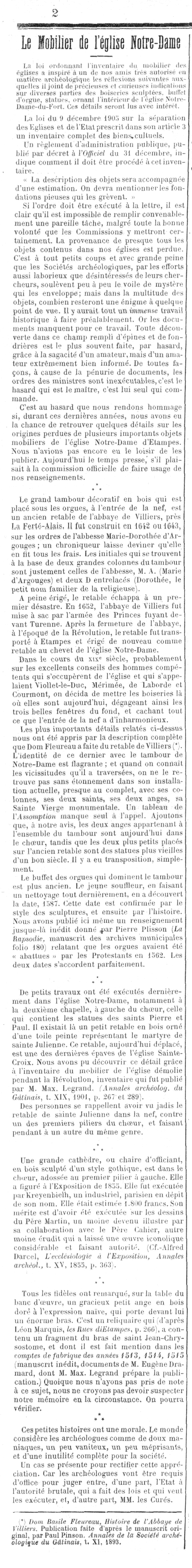 - La loi ordonnant l'inventaire du mobilier des églises a inspiré à un de nos amis très autorisé en matière archéologique les réflexions suivantes auxquelles il joint de précieuses et curieuses indications sur diverses parties des boiseries sculptées, buffet d'orgue, statues, ornant l'intérieur de l'église Notre-Dame-du-Fort. Ces détails seront lus avec intérêt.