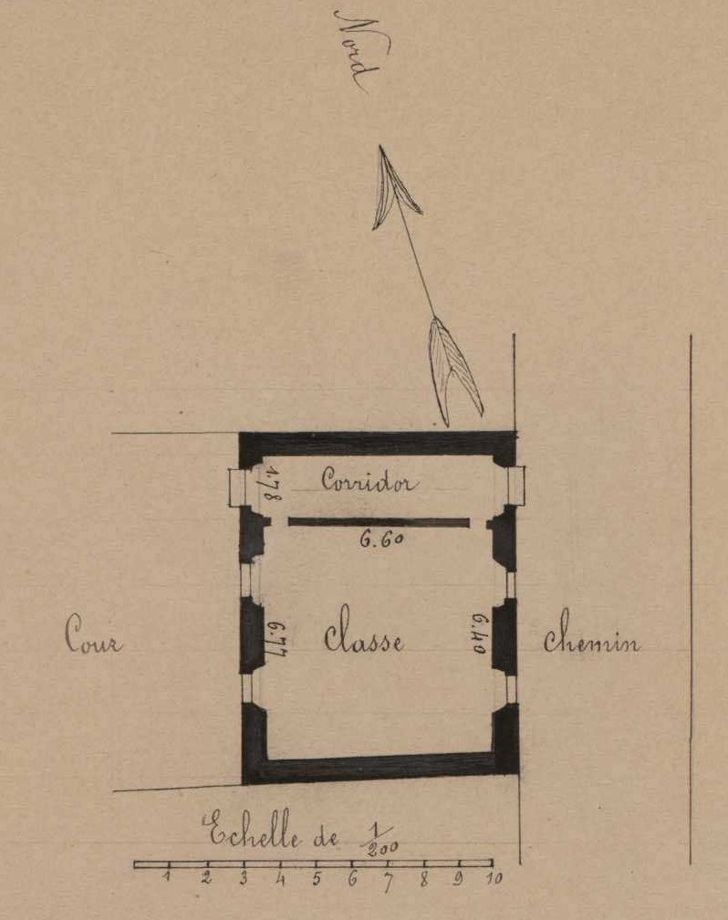 - La cour de récréation dans laquelle se trouvent deux cabinets d'aisance dont un pour les garçons et un pour les filles a une surface de 128 mètres carrés, y compris un préau de 7 mètres sur 4. Elle sépare l'école de la mairie et du logement de l'Instituteur qui est compsoé d'une cuisine et d'une salle à manger au rez-de-chaussée, de trois chambres à coucher au premier étage et d'un grenier au dessus. Une petite basse-cour permet à l'Instituteur d'élever quelques volailles et des lapins0 Le jardin, planté d'arbres fruitiers (poiriers et pruniers) et de cordons de vigne, a une contenance de 6 ares 30 et il est attenant à la maison d'habitation; malheureusement, le terrain par trop élevé est sec et n'est pas toujours cultivable, en été surtout, et les légumes dépérissent malgré de fréquents arrosages auxquels ont est obligé de renoncer.
