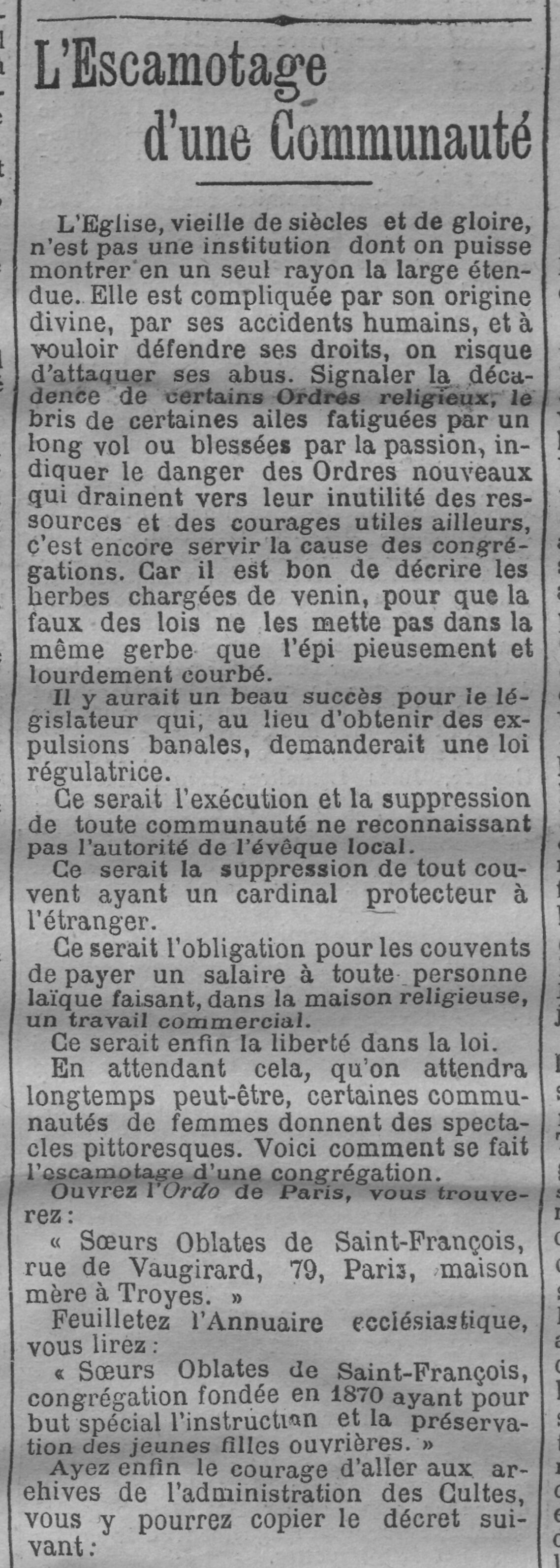 - “Sœurs Oblates de Saint-François, rue de Vaugirard, 79, Paris, maison mère à Troyes.”