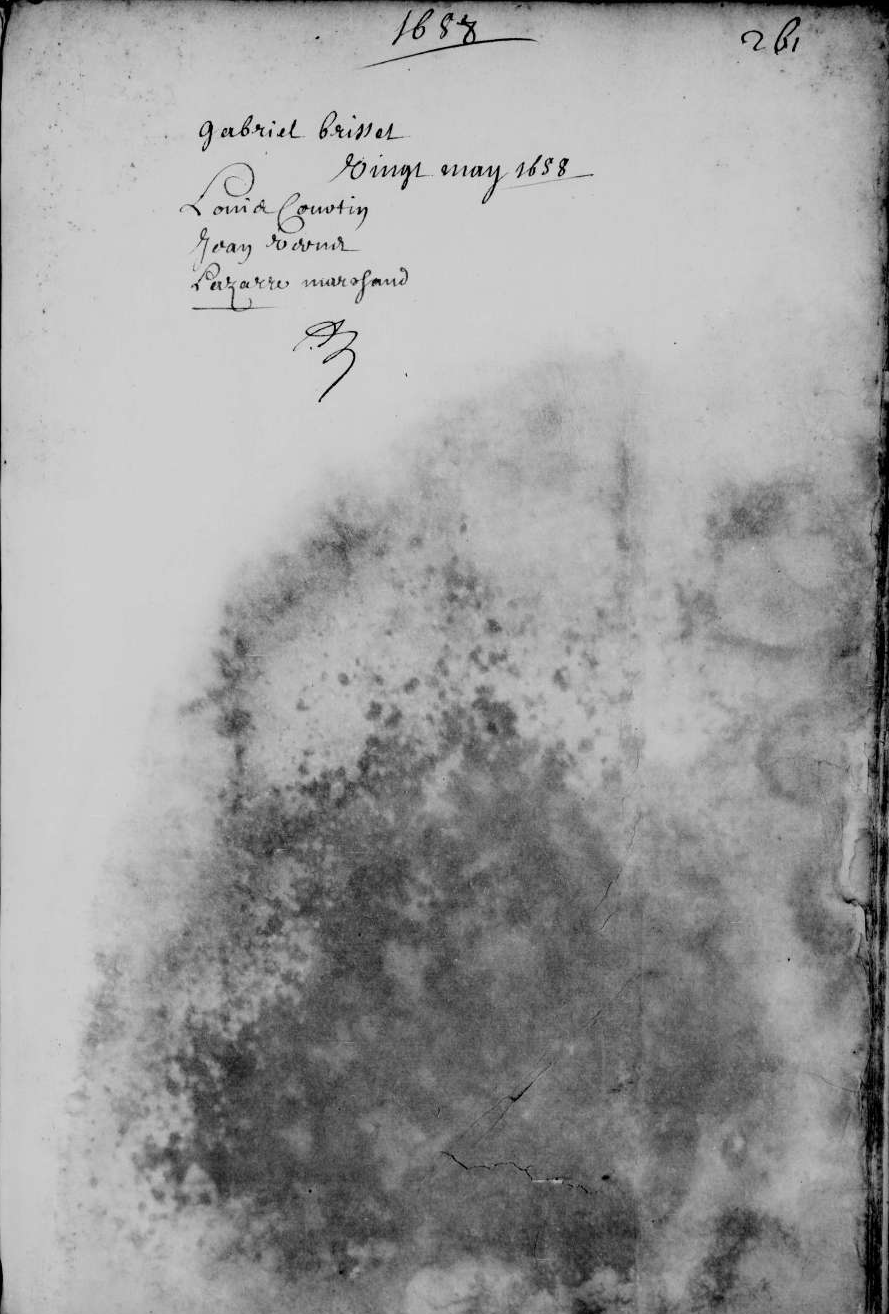 - Matériellement, cette liste est conservée dans un registre dont les cahiers ont été reliés et foliotés par le notaire lui-même, soit environ 260 feuillets de papier manuscrits de 31,7 cm sur 21,5 cm, composé de cahiers foliotés par le notaire lui-même. C'est un répertoire thématique d'actes divers pour la période allant de l'année 1636 au 17 janvier 1687, qui mentionne seulement pour chaque acte sa date et le noms et prénoms de chaque personne concerné. Notre liste en occupe quatre pages, depuis le verso du folio 253 jusqu'au recto du folio 255. En plusieurs endroits ce document est en mauvais état et présente des taches d'humidité qui gênent parfois sérieusement la lecture. Il a été heureusement scanné et mis en ligne par les Archives nationales, certainement dans l'idée qu'elle ne manquerait pas d'intéresser quelque historien local. Dont acte.