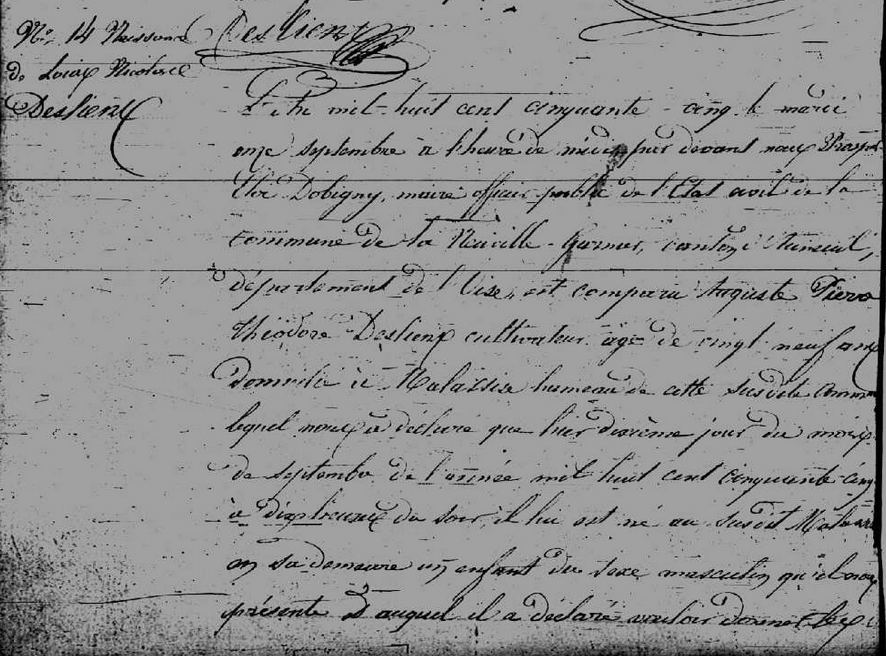 - Louis-Nicolas Desliens, né le 10 septembre 1855 à Malasisse, commune de La Neuville-Garnier (Oise), était le deuxième fils du meunier Auguste-Pierre-Théodore Desliens et de son épouse Fortunée Aimable Lanctin. L'un des témoins de sa naissance est un parent, Édouard-Henry Desliens, instituteur né le 30 mars 1829 à Berneuil-en-Bray et alors instituteur à La Neuville-Garnier.