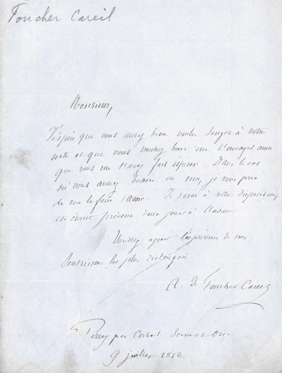 - Billet de Foucher de Careil (Château du Perray, 1856) — Site d'enchères eBay, octobre 2023.