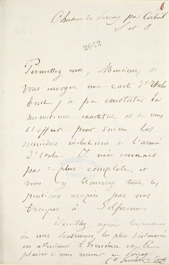 - Lettre de Foucher de Careil à Victor Cousin (Château du Perray, 1859) — Bibliothèque interuniversitaire de la Sorbonne MSVC 229, pièce 2042.