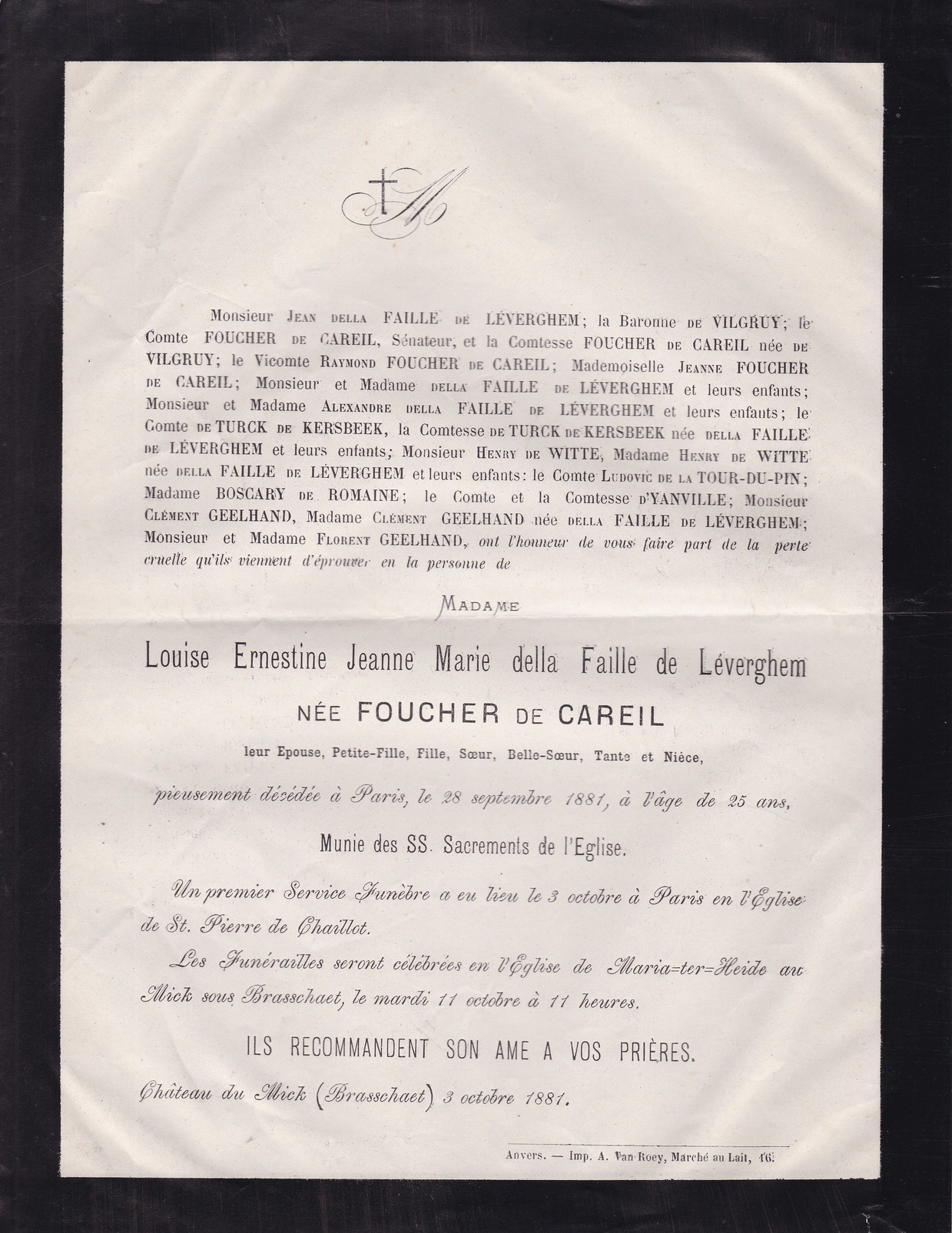 - 3° Louise-Ernestine-Jeanne-Marie Foucher de Careil (1856-1881), mariée le 30 décembre 1879 avec Jean della Faille de Leverghem (1851-1929)