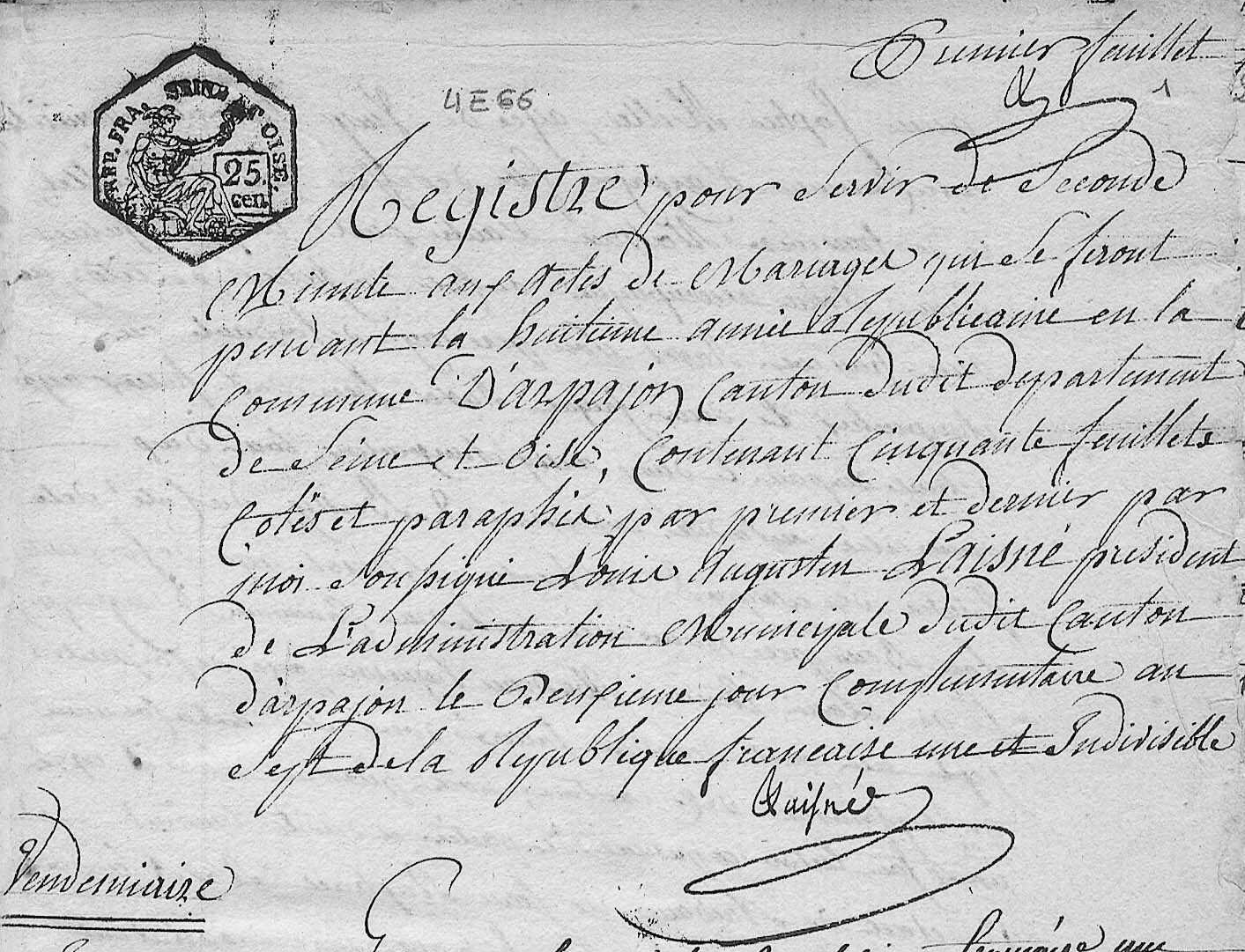 - Ouverture du registre des mariages d'Arpajon le 18 septembre 1799, alias 2e jour complémentaire de l'an 7 (AD91 4E/66)