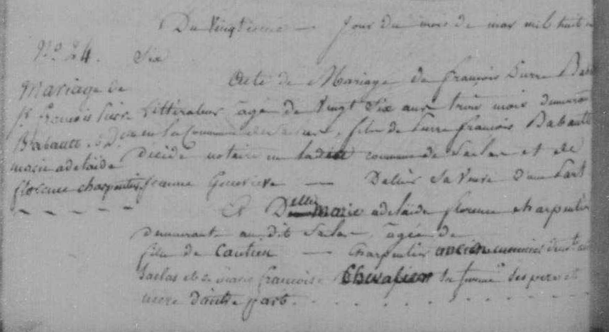 - François-Pierre Babault, né le 9 février 1780 à Saclas, était le fils du notaire Pierre-François Babault (c.1741-1802) et de Jeanne-Geneviève Dallier (née en 1749). Il se maria à Saclas le 20 mai 1806 à Marie-Adélaïde-Florence Charpentier (née en 1782), dont il eut une fille née à Saclas, Clotilde-Stéphanie Babault (1806-1883) et un garçon né à Paris, Charles-François Babault (1813-1893), qui fut médecin et maire d'Angerville.