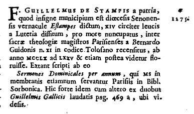 - F. Guillelmus Gallicus alter laudatur ab eodem Laurentio, et scripsisse dicitur: Postillam super Apocalypsin. — In catalogo sacrae theologiae magistrorum Parisensium apud Bernardum Guidonis n. XI recensetur F. Guillelmus Gallicus, et in codd ms. Rutenensi et Tolosano additur de Stampis, quod insigne municipium est dioecesis Senonensis leucis 14 Lutetia dissitum, qui quidem Guillelmus yidetur circa MCCL claruisse. Huic vero tum ob Gallici cognomen, tum ratione studiorum ejus aetatis opus allatum libens tribuerem. Cùm tamen aliunde nobis non desint Galli magistri etiam Parisienses, quales Guillelmus de Costa Pictaviensis, aliis Ingolismensis, anno MCCCXXIV clarus, Guillelmus de Castroreginaldi Bituricensis, qui et Gallicus dicitur anno MCCCXXVI florens, Guillelmus Caletot Normannus circa MCCCXXX et alii plures, quibus idem opus tribui potest, satius est rem dubiam relinquere.