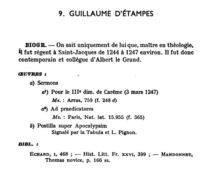- Palémon Glorieux, “9. Guillaume d'Étampes”, Répertoire des maîtres en théologie de Paris au XIIIe siècle, Paris, J. Vrin, 1933, I, p. 81.