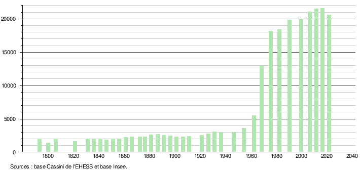 - Croissance démographique d'abord progressive (2343 habitants en 1901, 5552 habitants en 1962), qui s'accélère à partir des années 1960 (12929 en 1968, 18170 en 1975) avant de ralentir dans les années 1970 (18370 habitants en 1982, 20620 habitants en 2021).