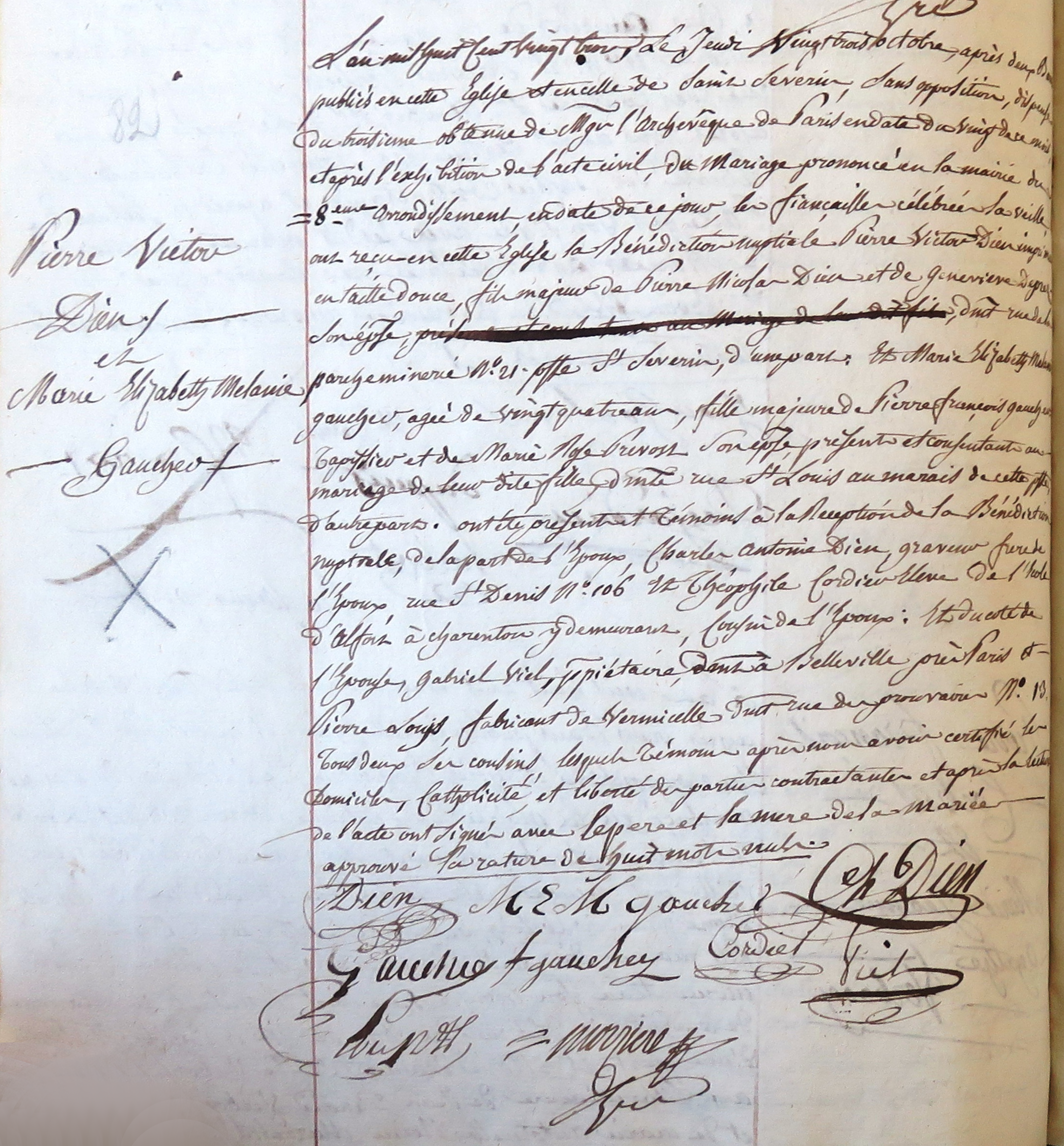 - Demeurant en 1823 à Paris paroisse Saint-Séverin, 21 rue de la Parcheminerie, fille de Marie-Rose Prévost et de Pierre-François Gaucher tapissier.