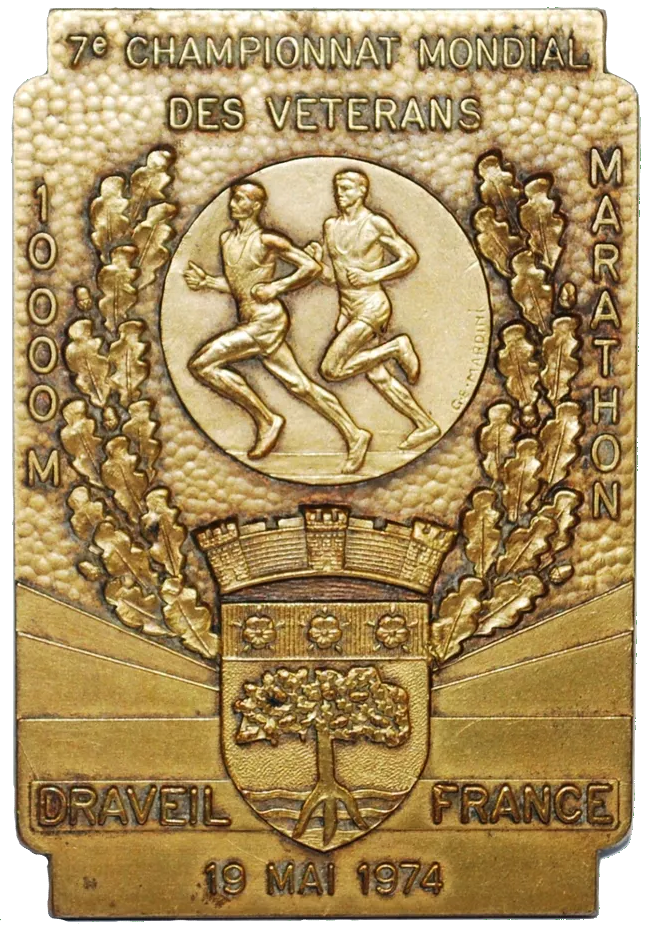 - Avers: 7e CHAMPIONNAT MONDIAL DES VETERANS — 10000 M — MARATHON — DRAVAIL — FRANCE — 19 MAI 1974 — C.E. MARDINI [médailleur]