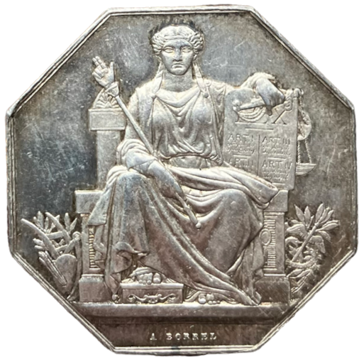 - Avers: LEX — ART. I — ART. II — ART. III — ART. IV. — BORREL [Alfred Borrel (1836-1927), médailleur]