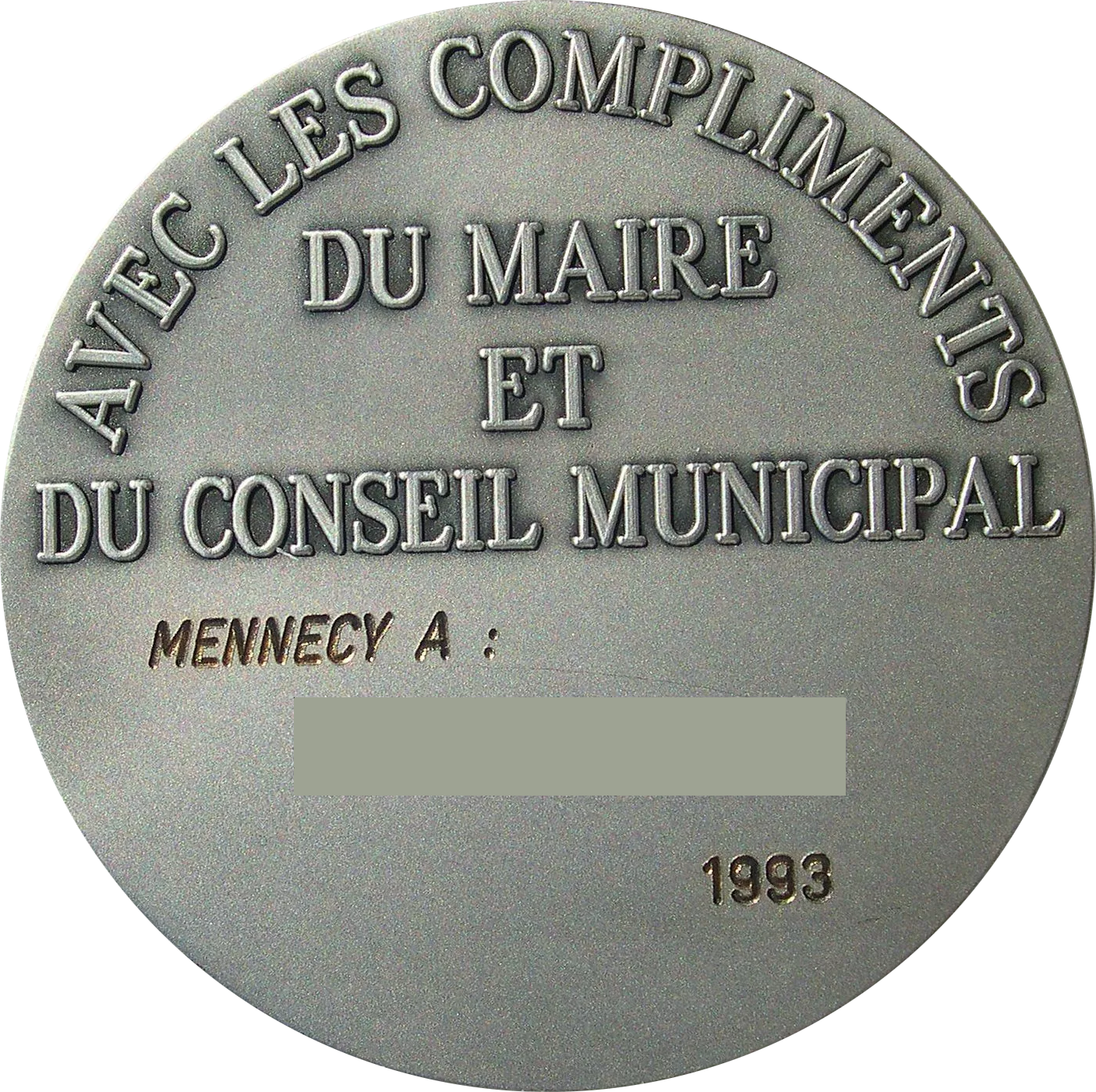 - Revers: AVEC LES COMPLIMENTS DU MAIRE ET DU CONSEIL MUNICIPAL — MENNECY A: [nom masqué] 1993.