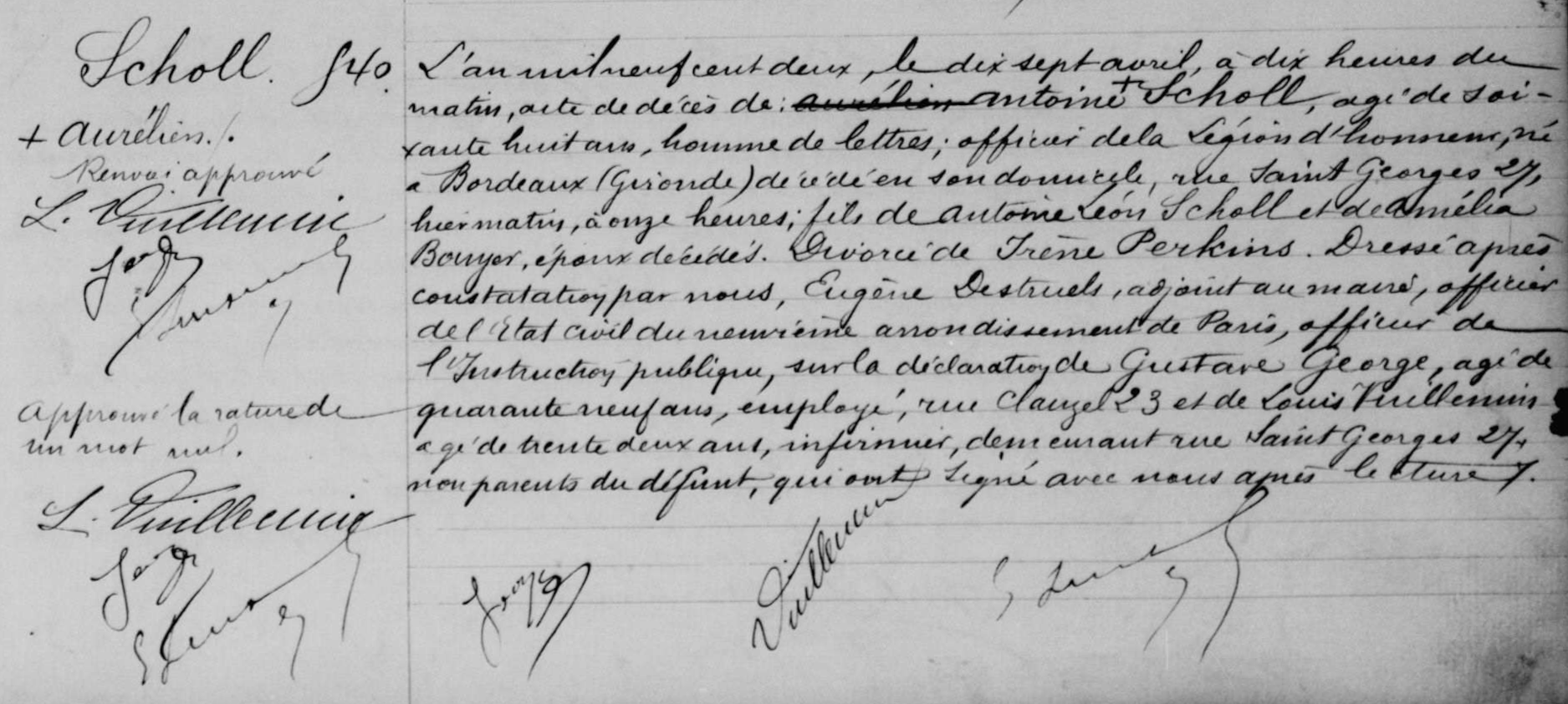 - Antoine-Aurélien Scholl, né à Bordeaux le 14 juillet 1833, était le fils de Marie-Thérèse-Amélie Bouyer et d'Atoine-Léon Scholl ancien notaire.