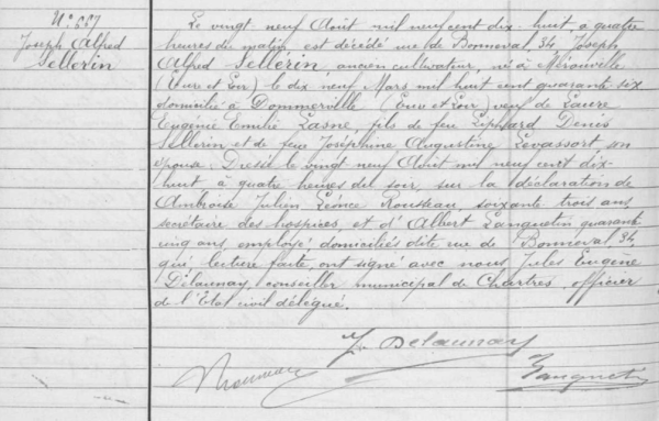 - Un dernier acte transcrit par Sellerin dans le registre d'état civil le 23 mai 1918. Une rectification y est ensuite portée par son adjoint Amilcar-Paul Leblanc le 30 juillet, il meurt le 29 août à l'hospice de Chartres.