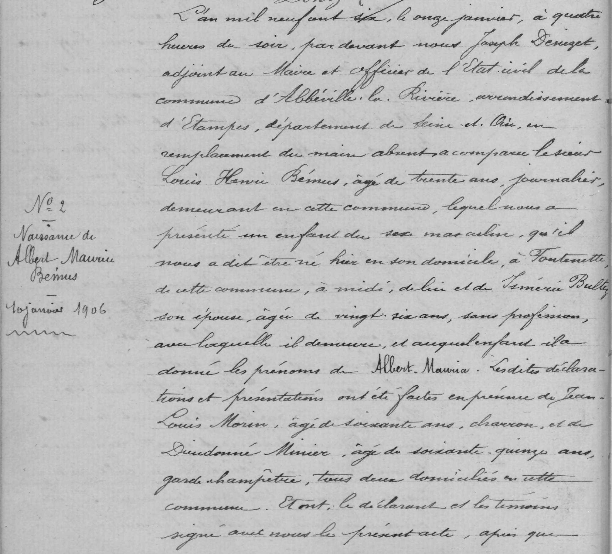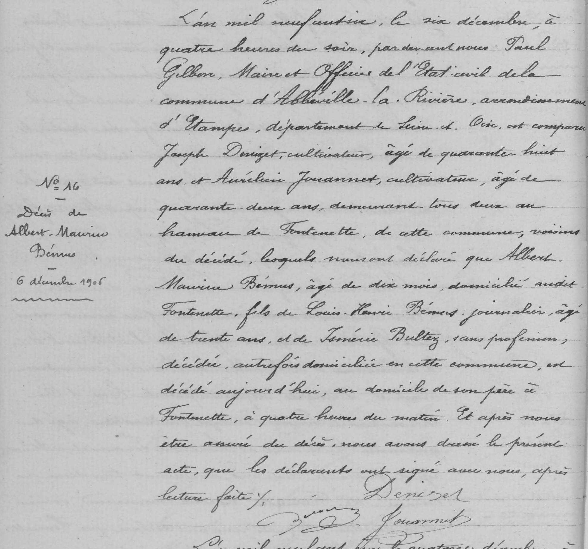 - Il mourut le 5 décembre 1906 à Fontenette âgé de 10 mois, assassiné par son oncle François Bultez en même temps que sa grand-mère Adrienne-Henriette Hervet veuve Bultez et que sa mère Ismérie Bultez épouse Bémus.