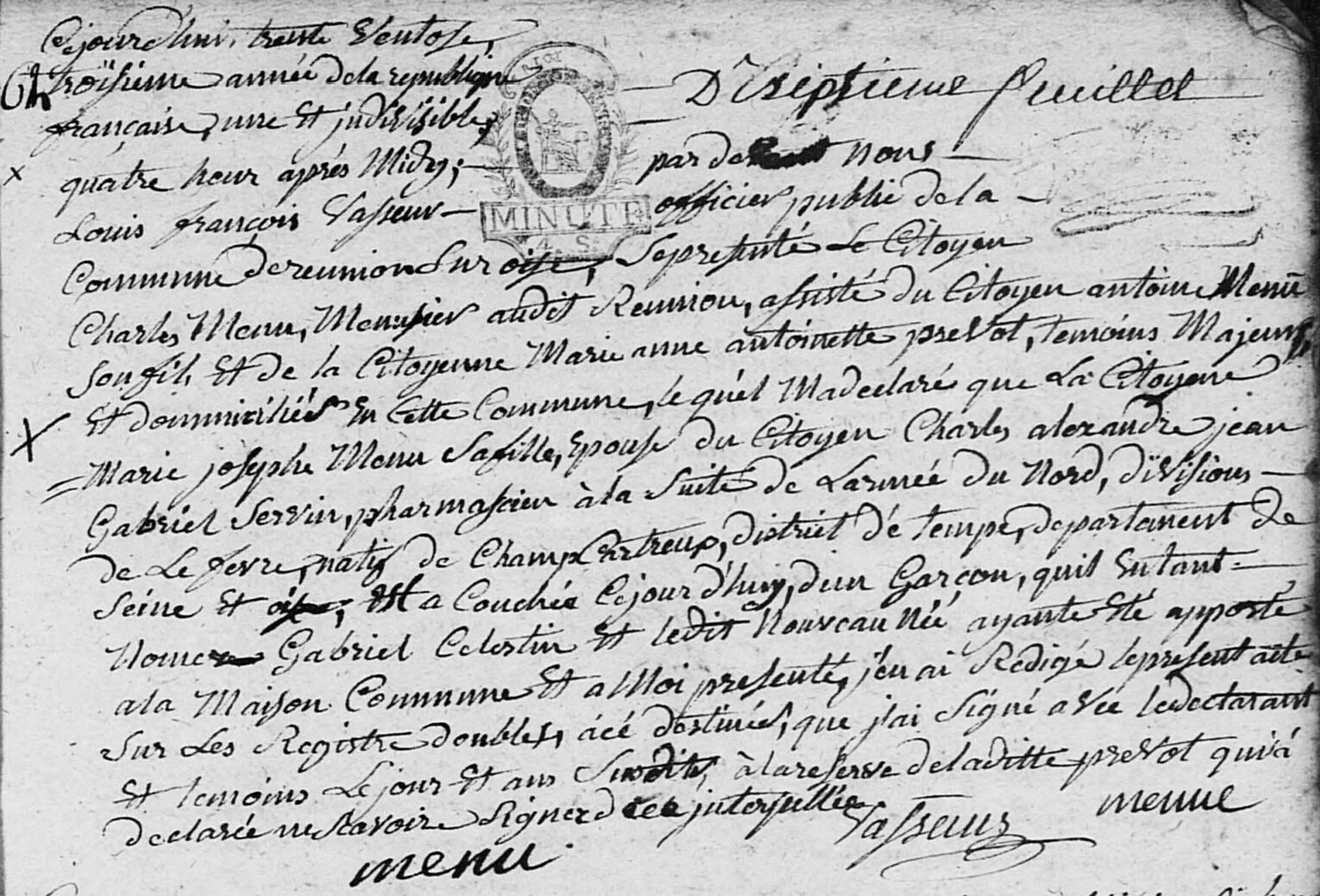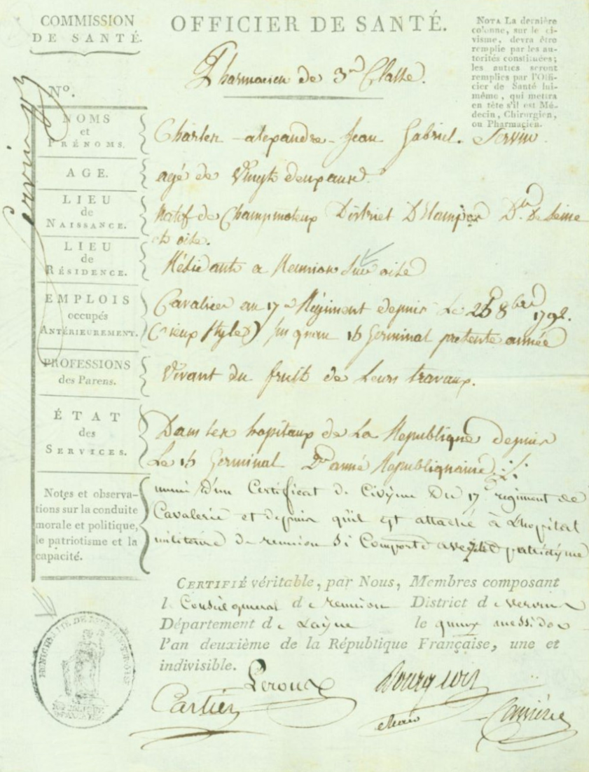 - Pharmacien à la suite de l'Armée du Nord, division de Lefèvre, à Guise (Aisne) qui s'appelait sous la Révolution Réunion-sur-Oise (…1795…)