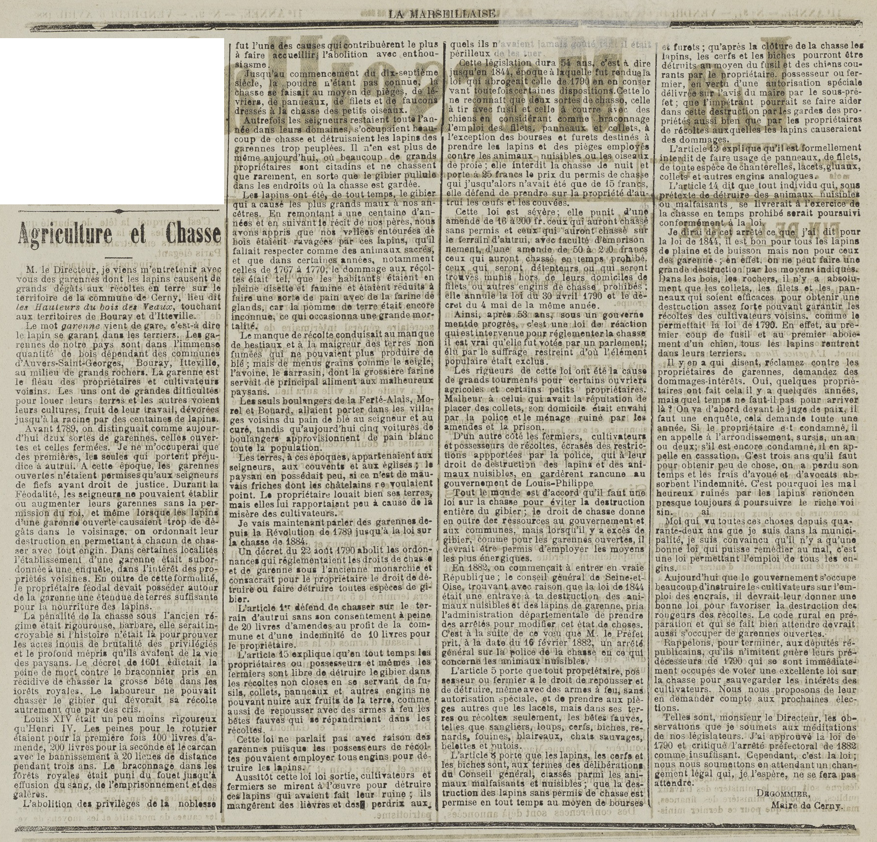 - M. le Directeur, je viens m'entretenir avec vous des garennes dont les lapins causent de grands dégâts aux récoltes en terre sur le territoire de la commune de Cerny, lieu dit les Hauteurs du bois des Veaux, touchant aux territoires de Bouray et d'Itteville.
