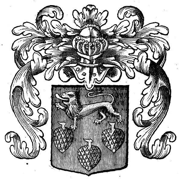 - Ses armes étaient de gueules à trois pommes de pin d'or, au lion de même passant en chef.